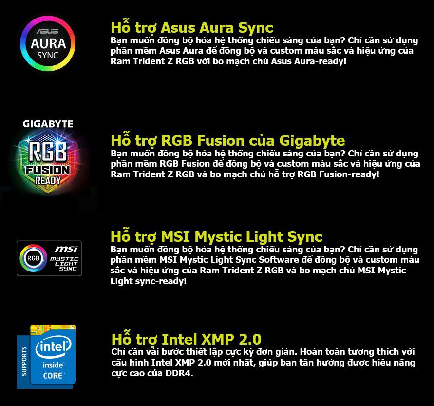 Ram PC G.SKILL Trident Z full length RGB DDR4 16GB Bus 3600 có khả năng tương thích và đồng bộ với Mainboard bạn đang dùng thông qua các phần mềm hỗ trợ tùy chỉnh đi kèm của Mainboard, bạn có thể tham khảo bên dưới |